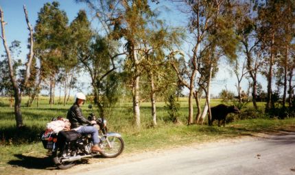 Now I'm fairly used to British bikes, but spare a thought for my friend. She's got a 200cc Honda Benly, electric start, and is used to the traffic round Reading. Now she's on a 350 ancient thumper, gear change on the "wrong" side, and upside down (1 up 3 down, plus lots of neutrals at random positions, except between 1st and 2nd). Its hot, the bikes are overheating and it's rush hour in Delhi. We got lost. The bikes would stop without warning. There were cars, bikes, taxis, rickshaws, people, cows, dogs, goats, fruit-stalls, hawkers, beggars, lorries and scooters four lanes deep. Some were on the road, others on the pavement. Some were on the right side of the road, others thought it quicker to try the other side. Everyone thought they could improve traffic flow by using their horns. We never worked out the right of way at roundabouts. Everywhere was chaos and the bikes would just cut out in the middle of it all. To start a Honda Benly you press a button. To start a Bullet you get the piston to just before TDC on the compression stroke, use the decompression lever to get it over the top, then "apply a swinging powerful stroke to the kick-starter" - a quote from the handbook. Then try again and hope it doesn't kick back and break your ankle, if you are lucky it starts. Anyhow, being far removed from the afore-mentioned Benly, we had to keep swapping bikes. It would be another three days before Ali had perfected the art of starting the thing. I'd put my bike on its stand, usually in the second or third lane, dodge the cars, bikes and animals, ignore the horns, shouts and beggars, and jump on the other bike. Hopefully, by this time Ali would have got to my bike before it stopped. I'd then apply the "swinging powerful stroke" to the other bike, and hope it didn't kick back. We continued like this for about two hours getting hotter and dirtier. My clutch was playing up, the bikes were hot, we were hot. It was noisy and we were beginning to despair, then suddenly we were out of Delhi. One minute we were going nowhere, the next it was up to the dizzy heights of 30 mph. (running-in speed). The only thing we hit was a bull, and it didn't seem to mind too much. The bikes cooled down and we were away. This is what we came to India for.