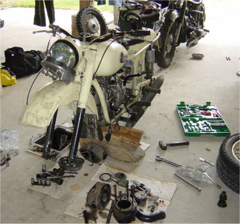 We rebuilt the M67 engine, found a cracked piston, scored barrels, a huge gap in the oil rings, and a blocked oil way - it now no longer smokes, goes faster, uses less petrol, and runs cooler. Now we had a decent place to work we also spent 3 or 4 days pottering with other things that had niggled, but had not stopping forward motion so had remained broken � brake lights, wobbles, speedos, that sort of thing. The only thing that we didn't fix was low charge on one battery, and the high one on the other. I guess the average between the bikes was 12V. We decided to only ride during daylight and ignore the vague feeling we had about there being a law in Europe about always having your headlamp on. We didn't really ever get the brakes working either, but got very good at reading the road ahead instead. Once we had both bikes running as we thought they should it was time to head off in different directions, Ignacio for Spain, me for Portsmouth.